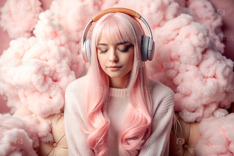 Молодая красивая японская девушка с розовыми волосами в аниме слушает музыку на беспроводных наушниках в розовых облаках