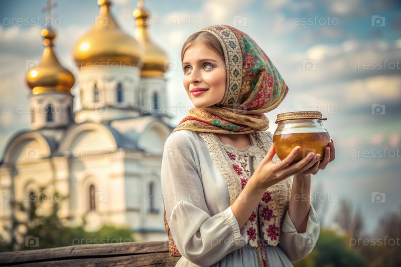 Концепция российского православного праздника 'Мёд Спаситель' Красивая девушка в русской национальной одежде и шарфе с баночкой меда на фоне православной церкви