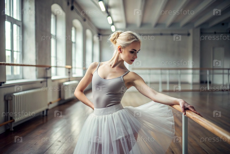 Портрет красивой молодой балерины в балетном зале, сияние русского балета, балерина в туту на фоне репетиционного зала