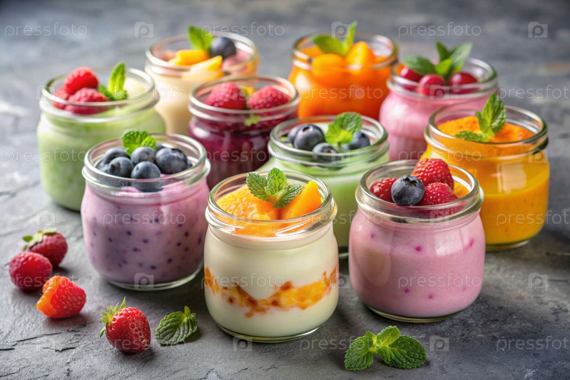 Разнообразный домашний йогурт с различными свежими ягодами и фруктами в стеклянных банках на стильном сером фоне