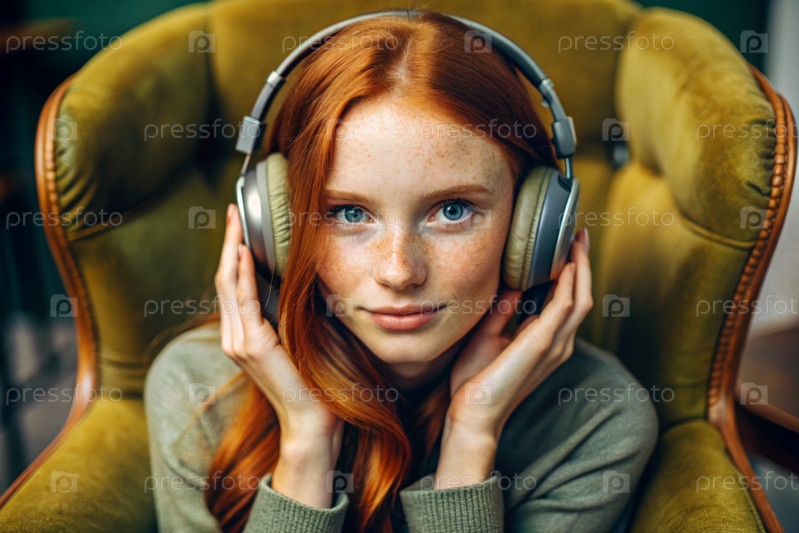 Молодая красивая рыжеволосая женщина с веснушками слушает музыку в больших беспроводных наушниках дома на стуле в гостиной