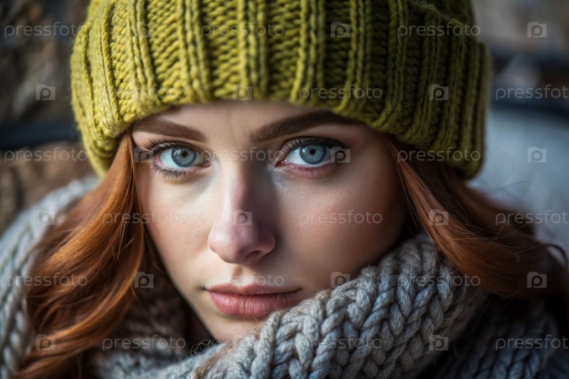 Осенний портрет. Близкий план молодой рыжеволосой женщины с выразительными зелеными глазами в вязанной шляпе и свитере