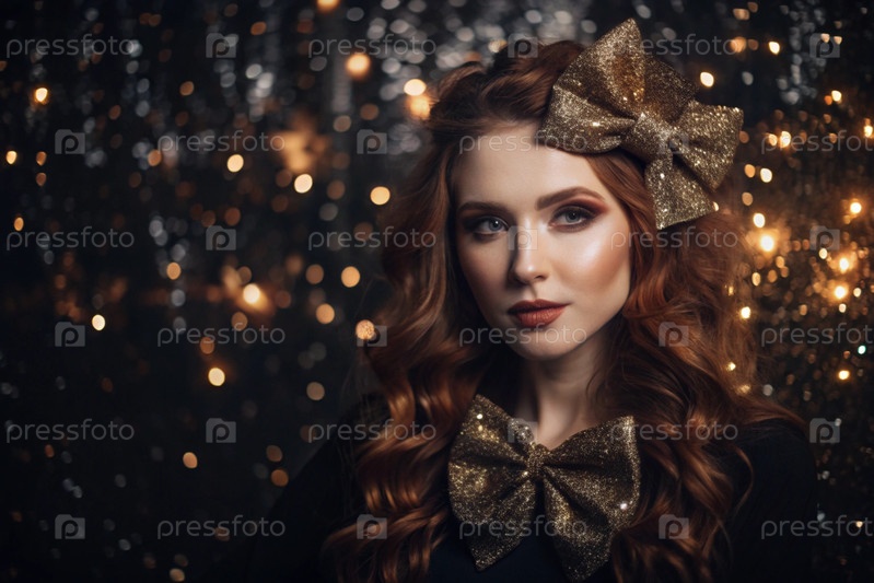 Портрет красивой рыжеволосой девушки с большим луком на голове.Концепция новогодних праздников, костюмированная вечеринка и подарки
