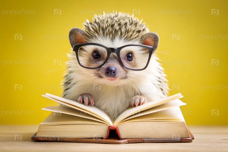 Забавный маленький колючий еж с очками читает книгу на желтом фоне