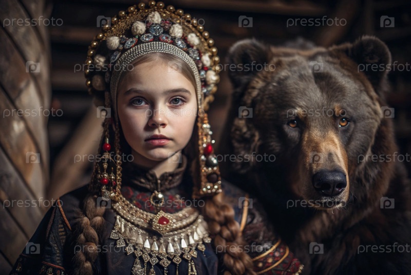 Красивая девушка в традиционном русском национальном костюме.Перед живым медведем.Портрет символизирует традиции и красоту русского народа