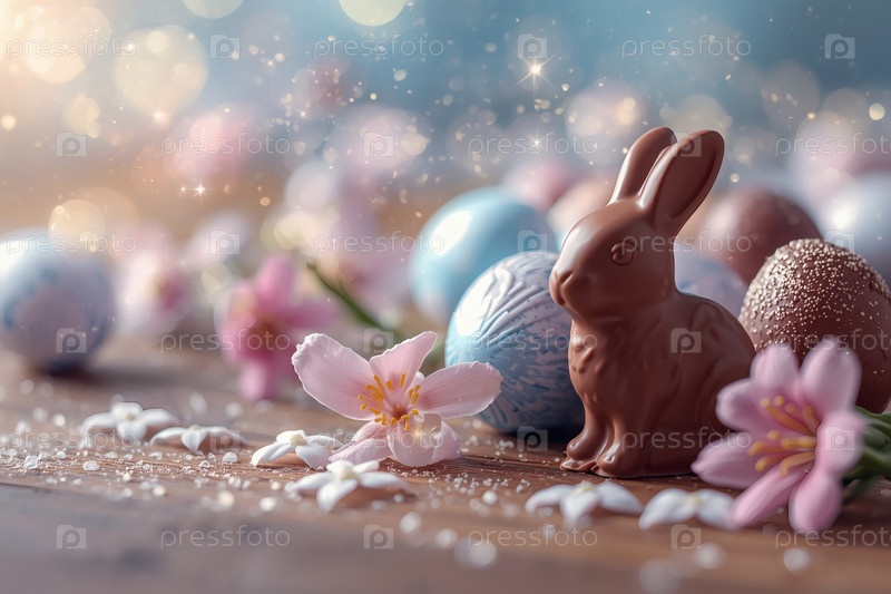 Пасхальные сладости и лакомства. Концепция ярких пасхальных праздников в 2026 году. Хорошая открытка. Баннер. Шоколадные пасхальные яйца, шоколадный кролик и весенние цветы на деревянном фоне
