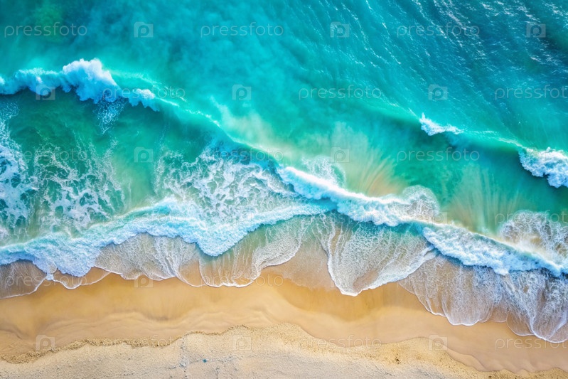 Концепция отдыха и путешествий. Красивый фон. Вид сверху на белый песчаный пляж и пенообразная волна бирюзового океана