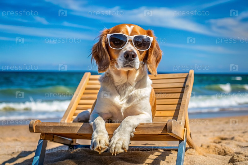 Счастливая собака на пляже в солнцезащитных очках лежит на деревянном шезлонге. концепция курортного отдыха с домашними животными