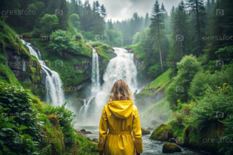Женщина в резиновом плаще среди огромного голубого водопада. она путешествует и наслаждается жизнью и окружающей средой. туризм