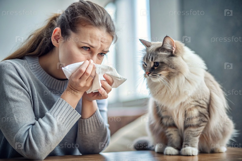 Женщина чихает в белую салфетку дома. Аллергия на волосы кошек и домашних животных. Рядом со мной кот