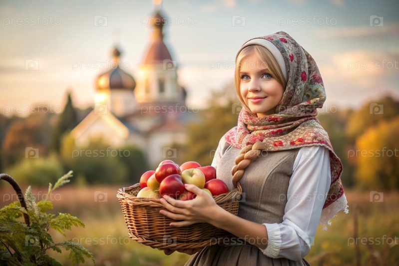 Концепция русского православного праздника Apple resort. Красивая девочка в российской национальной одежде и шарф с корзиной спелых красных яблок на фоне Православной церкви