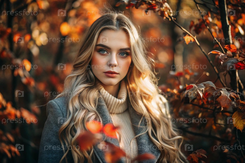 Осенний портрет. Близкий план молодой блондинки с выразительными глазами в вязанном свитере. Красивая девушка в осенних листьях