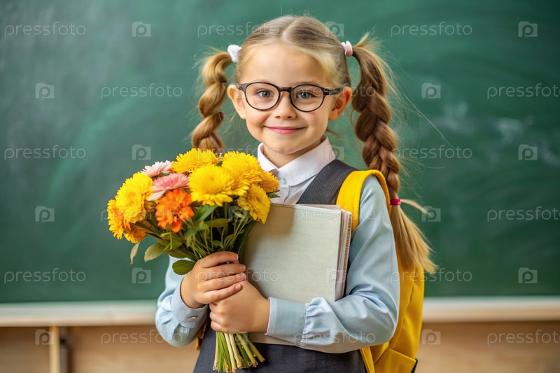 Красивая первоклассница с очками и коньими хвостами на голове. Букет осенних цветов. Ребенок впервые идет в школу. Ребёнок с рюкзаком, книгой и цветами. Возвращение в школу