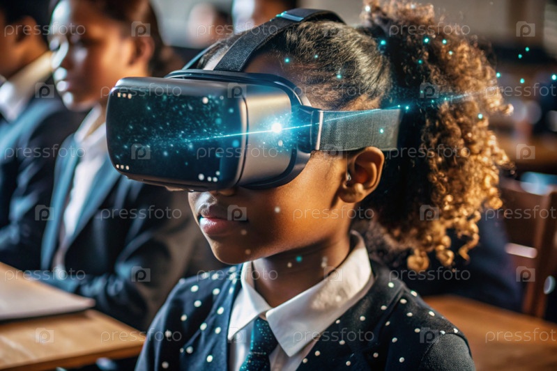 Чернокожая африканская девушка с очками виртуальной реальности.Ребенок находится в классе, а другие ученики на заднем плане.Цифровой интерфейс отображается в наушниках