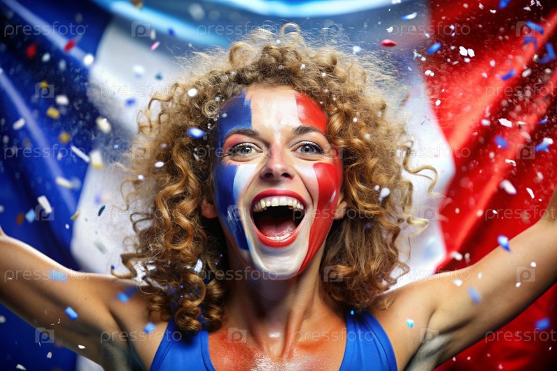 Красивая спортсменка или чирлидер из Франции с радостными криками после победы на Олимпийских играх на фоне французского флага
