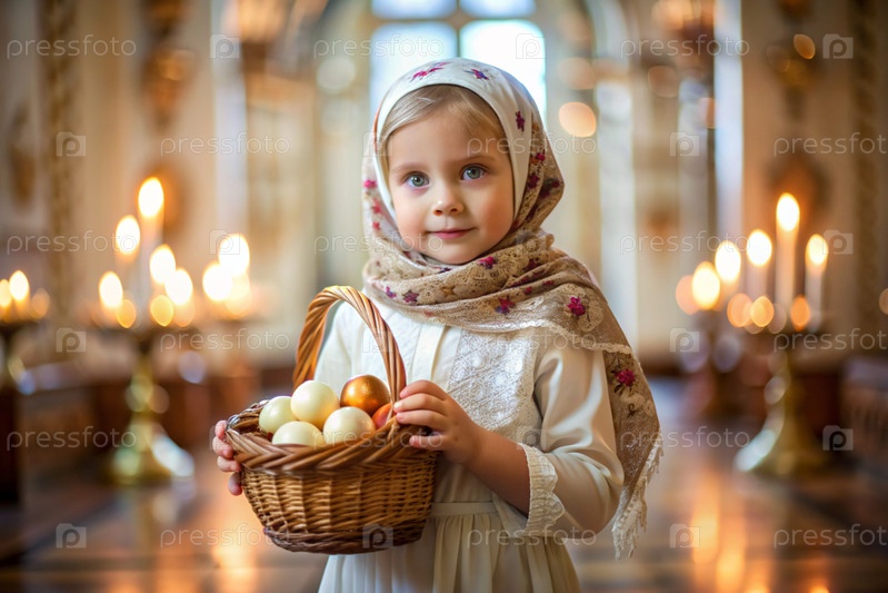 Счастливая Пасха. Христианство. Портрет трехлетней девочки в русском народном платье и шалах с корзиной из плети с пасхальными яйцами в руках на фоне православной церкви