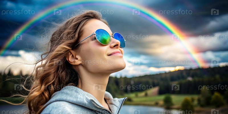 Счастливая женщина-хиппи в круглых солнцезащитных очках на фоне радуги.Девушка занимается медитацией и глубоким дыханием
