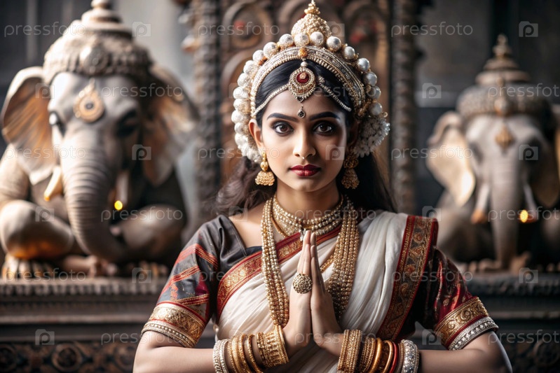 Красивая индийская девушка в традиционном национальном костюме, сари. со слонами. портрет символизирует традиции, культуру и красоту народа Индии