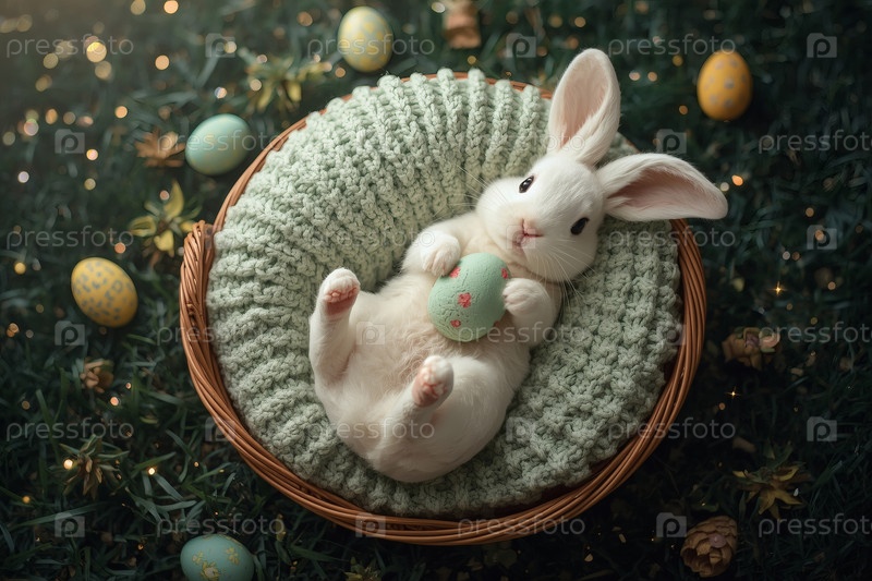 Пасхальный кролик пасхальное яйцо в лапах, лежащее на спине на сером вязанном одеяле в корзине из колючки и уставившееся в камеру