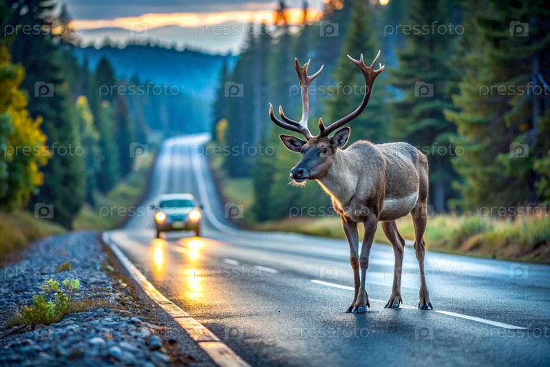 ДТП.Животное - это олень на дороге возле леса рано утром.Дорожные опасности, дикая природа и транспортное средство