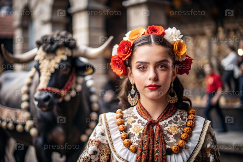 Испанская девушка в традиционном испанском национальном костюме. Перед быком. Бикоборство. Портрет символизирует традиции и культуру народа Испании