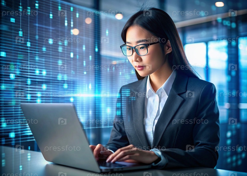 Красивая молодая азиатская девушка в костюме работает на ноутбуке в офисе с цифровыми кодами на виртуальном экране Цифровые технологии будущего Разработка программного обеспечения