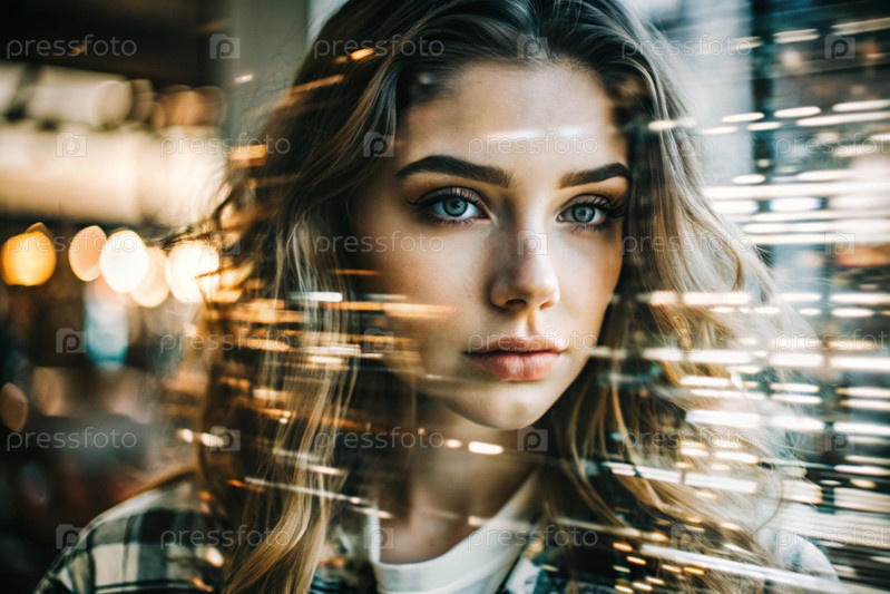 Портрет молодой женщины.Концептуальное искусство Клубовое изображение на фоне города с двойной экспозицией и визуальными эффектами