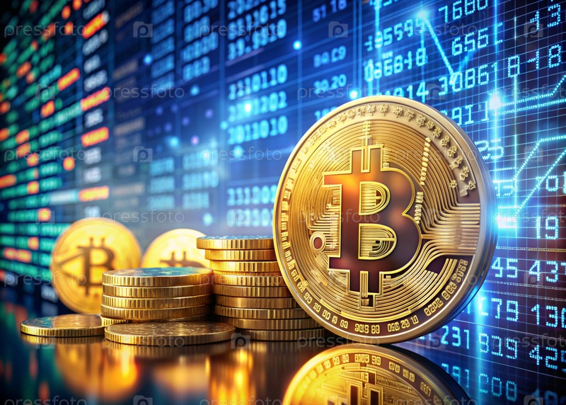 Золотые монеты - это биткойны с обменным курсом на виртуальном экране.Изображение создано с использованием искусственного интеллекта