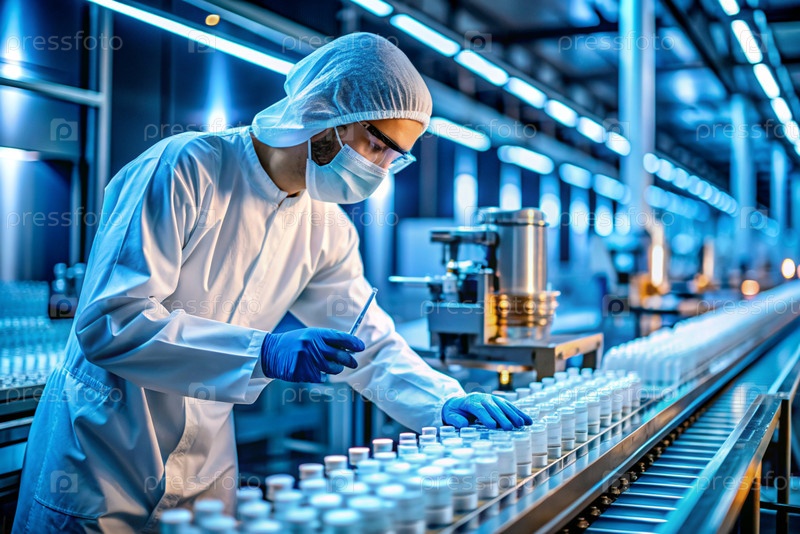 Производство лекарств: фармацевт тестирует медицинские флаконы на автоматическом трубопроводе фармацевтической производственной линии с использованием искусственного интеллекта
