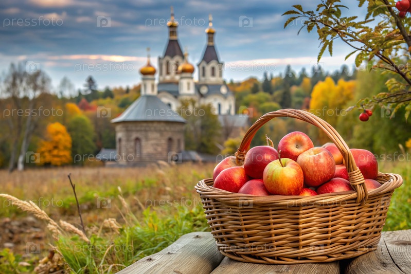 Концепция русского православного праздника Apple resort.Прекрасная плетеновая корзина из виноградных лоз с красными спелыми яблоками на фоне православной церкви