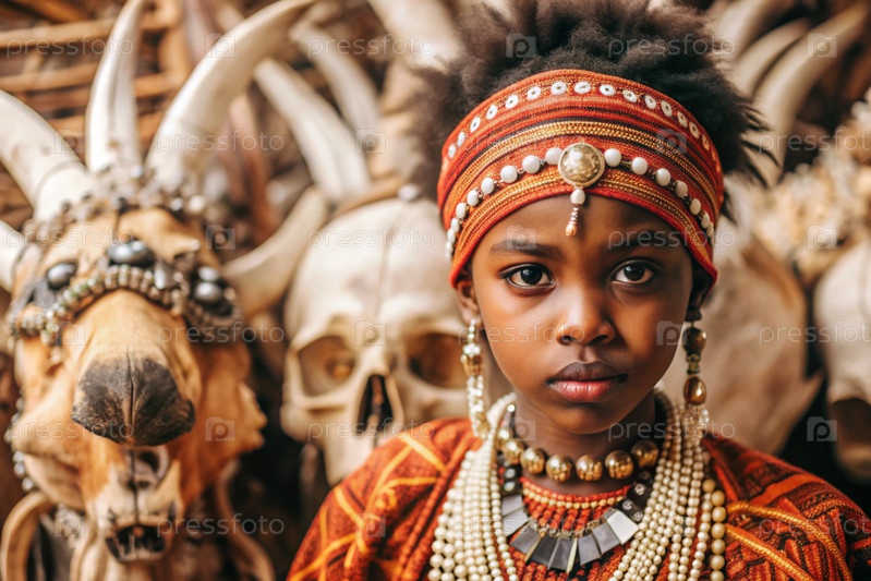 Красивая африканская девушка в традиционном национальном костюме. с костями. портрет символизирует традиции, культуру и красоту африканского народа