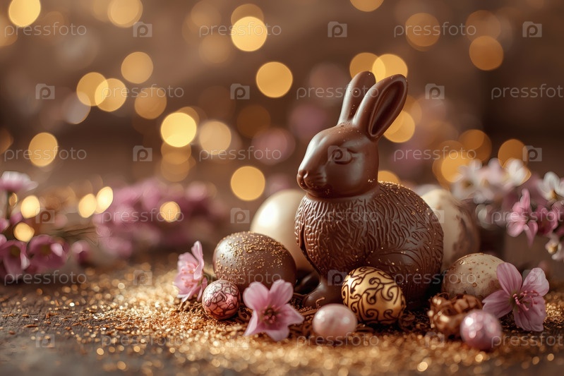 Шоколадное пасхальное яйцо, шоколадный кролик и весенние цветы на деревянном фоне. Пасхальные сладости и лакомства. Концепция яркого праздника Пасхи в 2026 году. Хорошая открытка