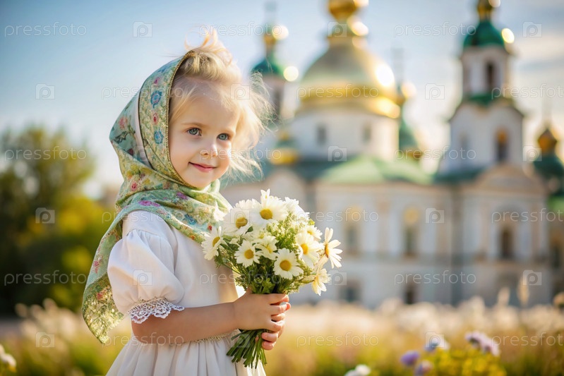 Всероссийский день семьи, любви и верности Красивая маленькая кудрявая девочка в соломенной шляпе с букетом ромашки на фоне поля. День святого Валентина Петра и Февронии