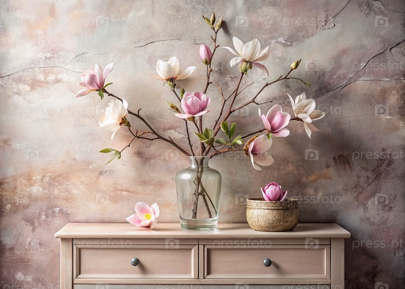 Красивая ветвь розовой магнолии в стеклянной вазе и флаконы на старом деревянном шкафу. Букет цветов в вазе в интерьере дома. Светлый, бежевый, розовый цветочный фон