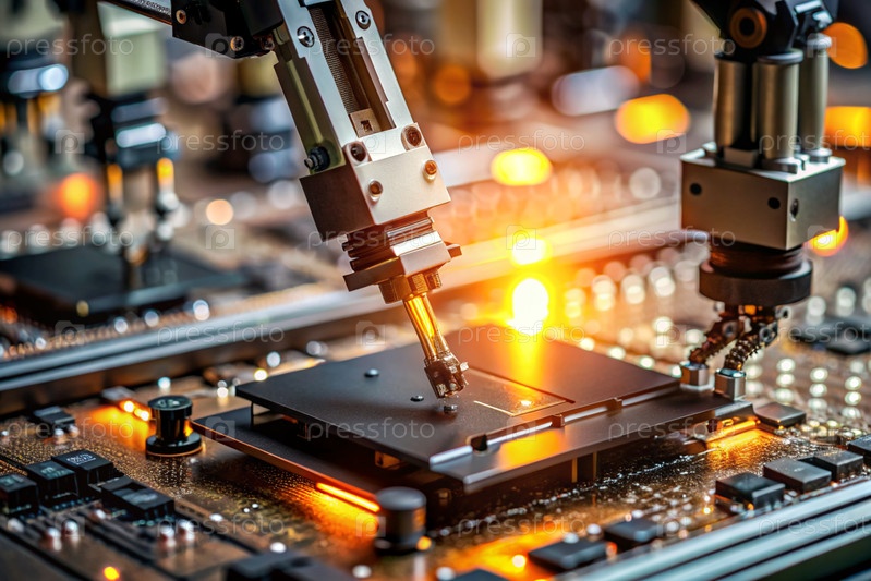 Автоматизированное производство электронных устройств. Современные роботизированные манипуляторы на сборочной линии чипов и печатных платок на современном электротехническом заводе. Установка компонентов на доске