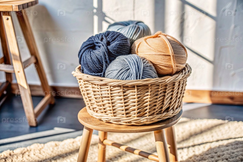 Шары из пряжи в плетеной корзине на деревянном стуле. Игла, текстиль, вязание. Зимний сезон, малый бизнес, ручная одежда