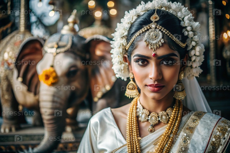 Красивая индийская девушка в традиционном национальном костюме, сари. со слонами. портрет символизирует традиции, культуру и красоту народа Индии