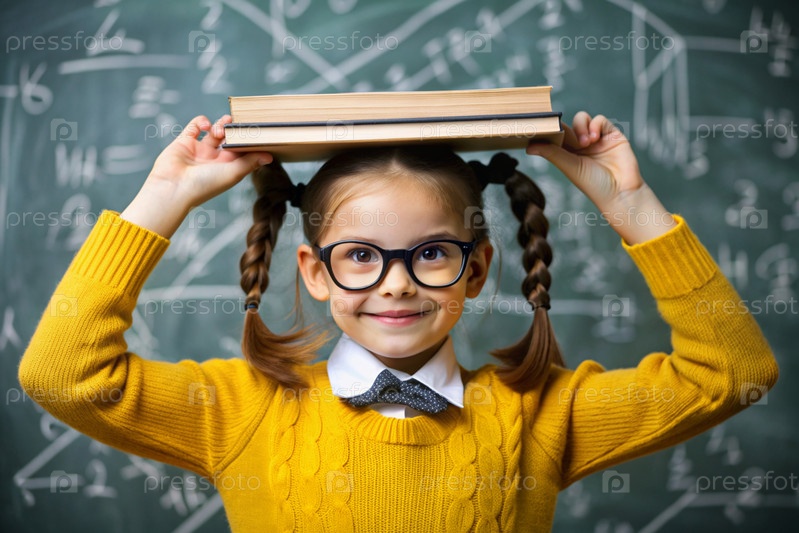 Красивая девушка с очками и книгами на голове. Ребенок впервые идет в школу. Ребёнок в классе со доской на заднем плане. Возвращение к школе