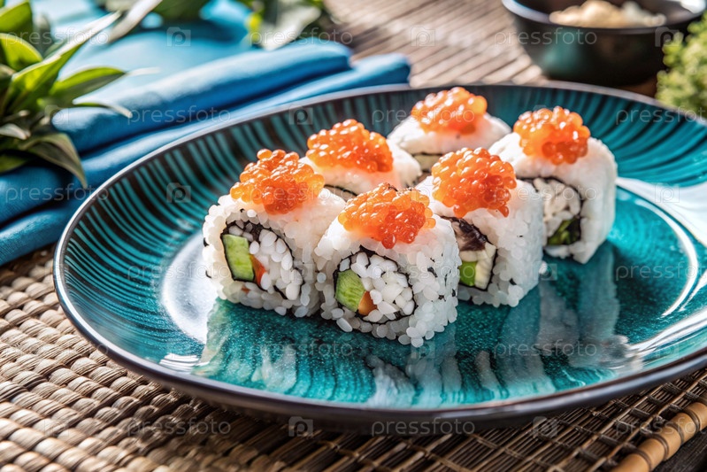 Японская еда. Суши-роллы Калифорния, Филадельфия с угорьем, красной икры и лососем. Концепция меню суши-бара