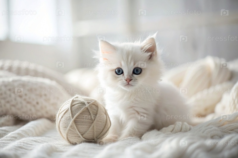 Животные. маленький пушистый белый котенок играет с шариком пряжи на белой кровати. любопытный кот лежит на белом одеяле и смотрит в камеру. текстиль, вязание