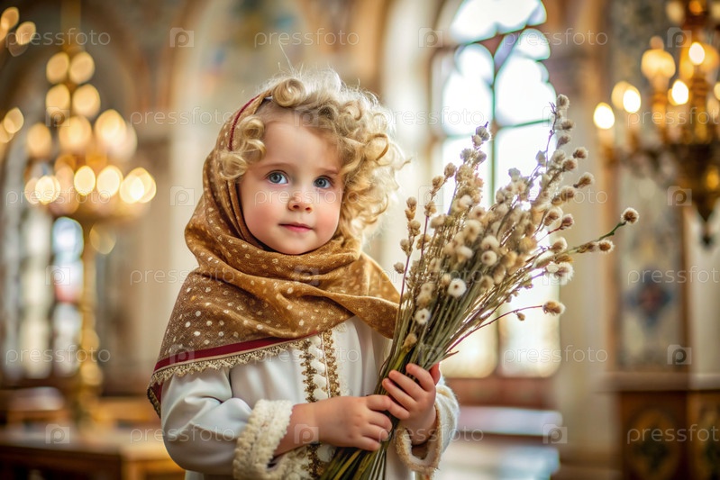 Пальмовое воскресенье. христианство. портрет трехлетней девочки в русском народном шале с ветвями ивы в руках на фоне православной церкви