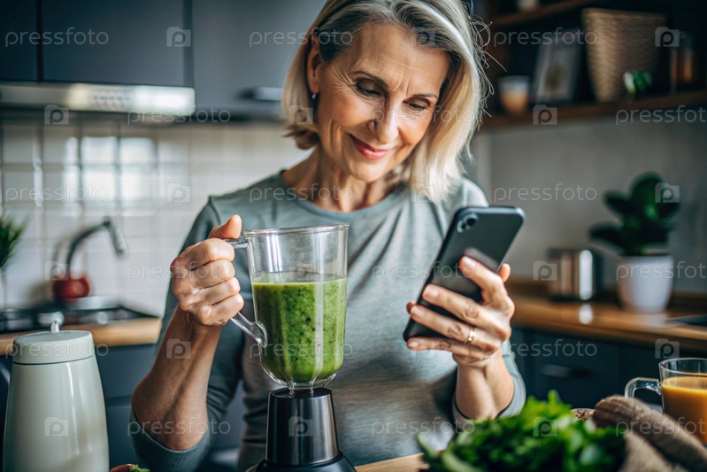 Пожилая женщина на кухне смотрит на рецепты здоровой пищи по телефону и готовит овощный коктейль из брокколи в блендере