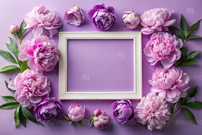 Рама с красивыми цветками пиони на пастельно-фиолетовом фоне