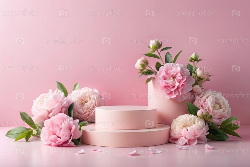 Минималистский розовый пастельный фон для демонстрации продукта.Современный подиум с розовой стеной и розовыми пионками вокруг.Креативный дизайн презентации продукции