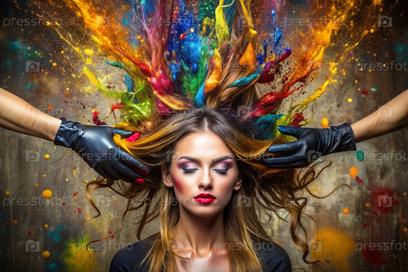 Творческий баннер для салона красоты или парикмахера. Модное профессиональное окрашивание волос. Красивая женщина с длинными многоцветными волосами. Взрыв цветов на голове