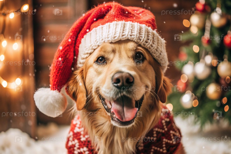 С Новым годом и Рождеством! Падает снег. Веселая собака Золотой ретривер сидит в шляпе Санта-Клауса