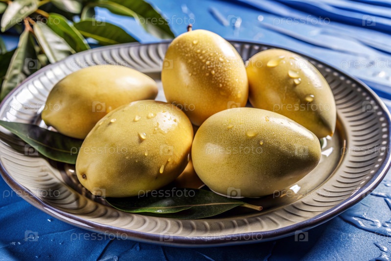 Свежие манго. Вкусные ягоды и фрукты ярко-желтого цвета с капельками воды. Вегетарианство. Здоровое питание. Свежий плод на столе