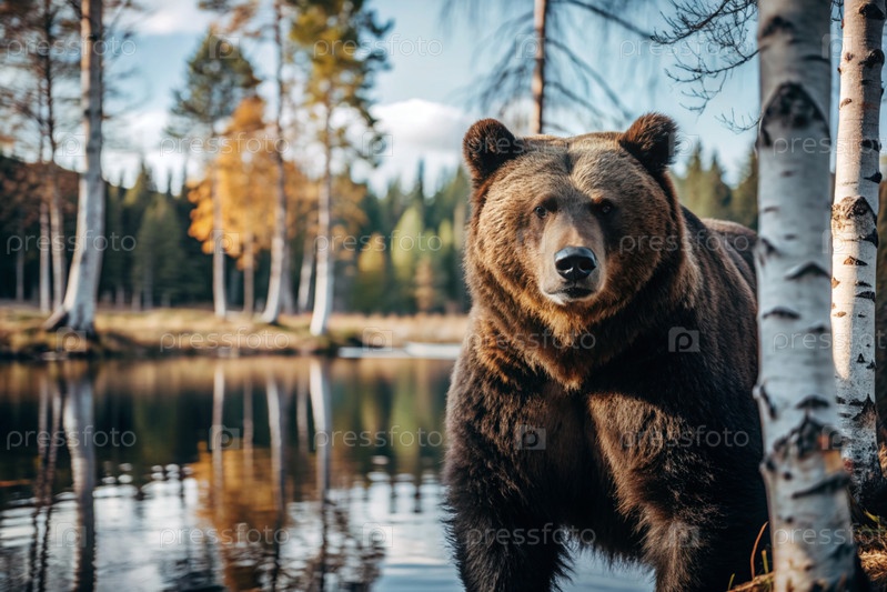 Большой коричневый медведь против березовой рощи.Охота на животных.Браконьерство
