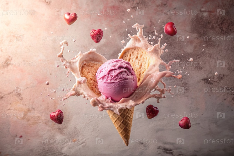 Сладкий десерт. Любовь к мороженому. Сердечно-образный конус мороженого с брызгами, сердцами и пятнами. Концепция Дня святого Валентина. Баннер, реклама