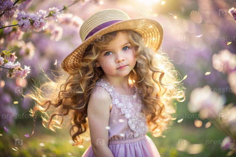 Портрет красивой маленькой кудрявой 4-летней девочки в соломенной шляпе и платье в цветущем лиловом саду. Детство. Ребенок позирует и смотрит на камеру